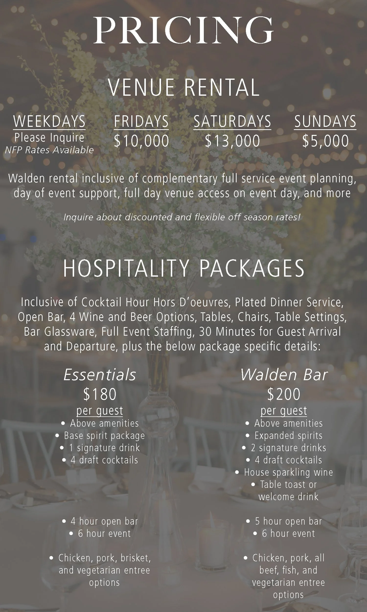 Your event is a living mosaic. We pull all the pieces together for you under one West Town roof to create a seamless, sustainably minded experience. Every party, and the work that goes into planning it, should feel this natural. The process and pricing should be transparent. At Walden, it does and it is. Included in every buyout: chef-driven cuisine, top-tier bar service, rentals, staffing, amenities and the full scope and hands-on support of our event planning team.