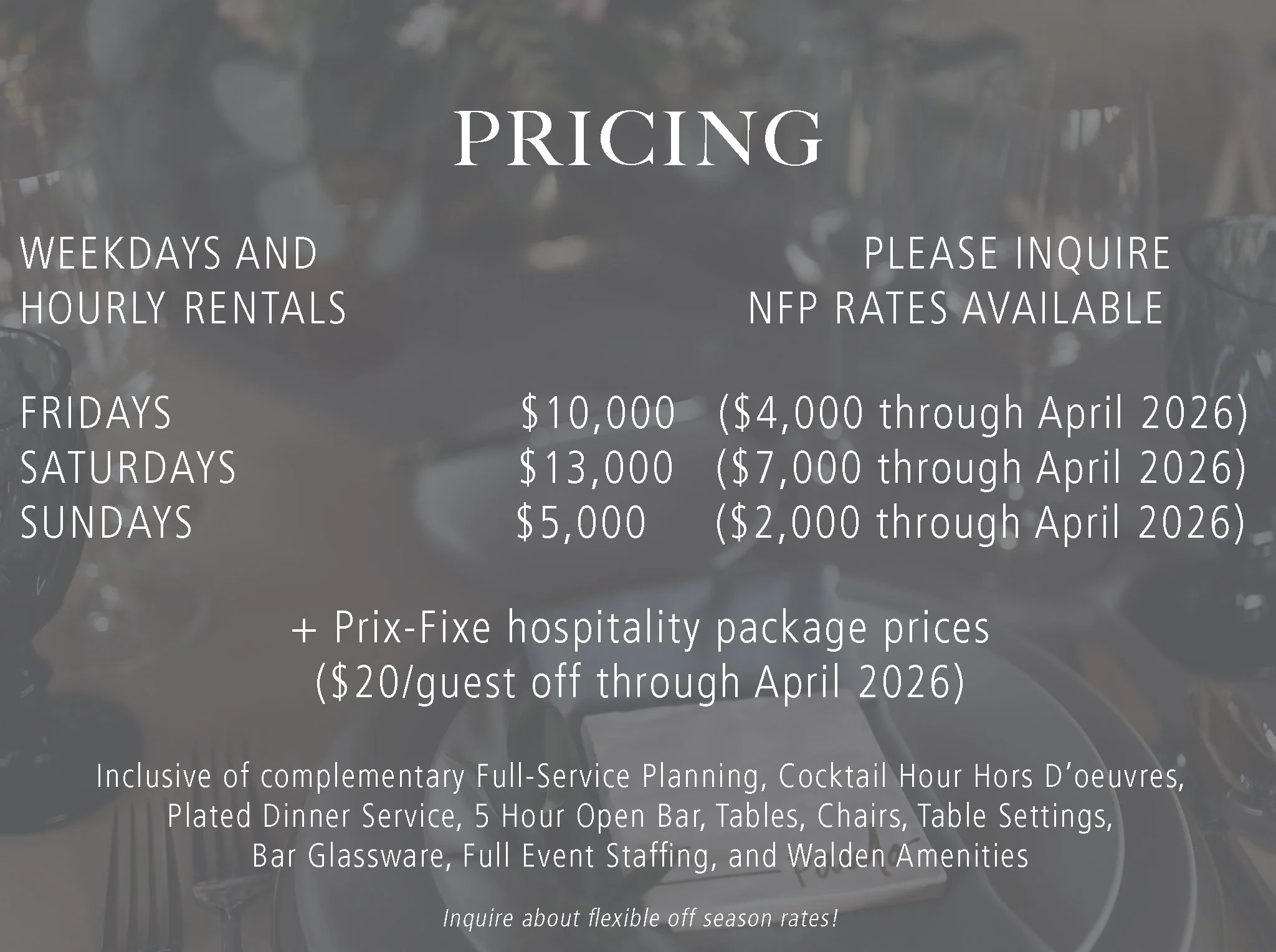 Your event is a living mosaic. We pull all the pieces together for you under one West Town roof to create a seamless, sustainably minded experience. Every party, and the work that goes into planning it, should feel this natural. The process and pricing should be transparent. At Walden, it does and it is. Included in every buyout: chef-driven cuisine, top-tier bar service, rentals, staffing, amenities and the full scope and hands-on support of our event planning team.